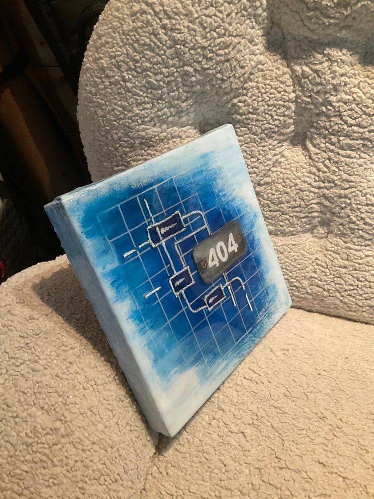 Bring a clever tech twist to your wall with this original mixed‑media piece, inspired by the classic “404 – Not Found” error. The artwork features a deep blue, blueprint‑style background with hand‑drawn circuit/flowchart lines, framing a metal‑style plate with the number 404 mounted in the center. The combination of technical diagram and painterly texture makes it perfect for developers, designers, and anyone who loves geeky art with a sense of humor.
